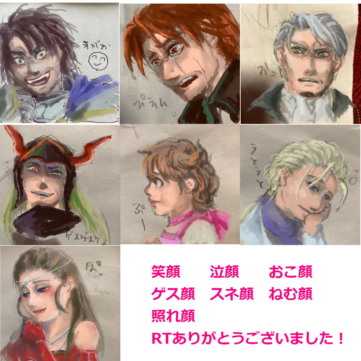 #今月描いた絵を晒そう 今月は14枚+楽器とハイランダー 途中でペンタブが壊れたのもあって、 みんな同じ顔して同じ構図だなって すごく反省してる 少しでもいいわねーって思ってくださる方がいたとしたら、 それはキャラクターの持つ魅力に助けられてるだけなので、 慢心しないよう自戒をこめて晒す