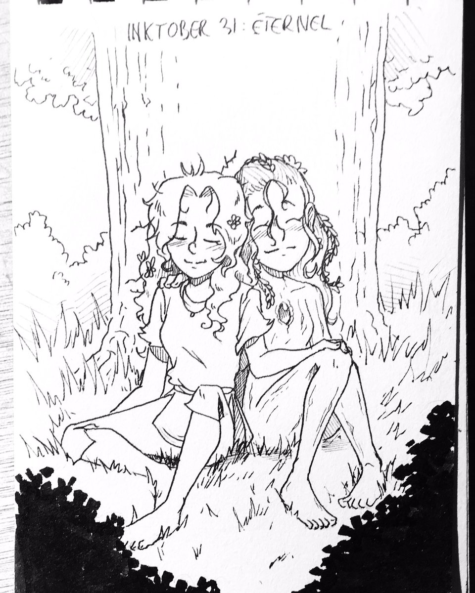 #adrinktober2021 Jour 31 : Éternel 1/3 Elles ont des longs cheveux avec des feuilles dedans, et elles s’aiment très fort 😌 #inktober2021