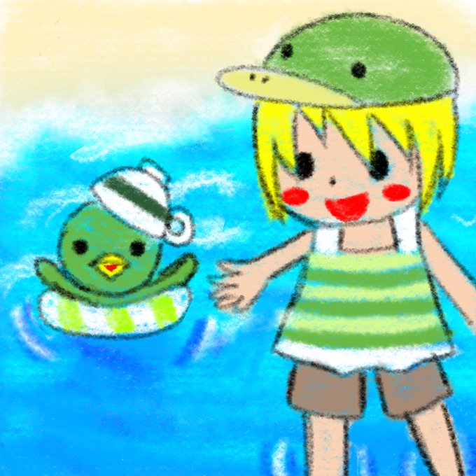 7月○日きょうはおちゃぺんと、うみにあそびにいったよ!たのしかった!! お題が水着だったので、夏休みの絵日記みたいに描きました。クレヨンで描いたみたいにしたかったのでこういう感じにしました! #きとこるお絵描企画