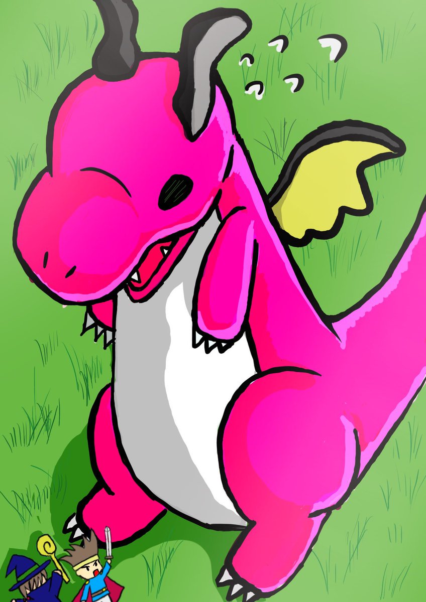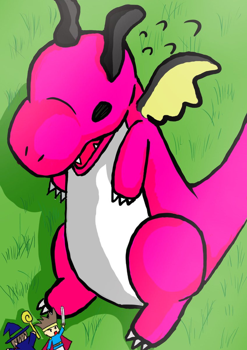 今週のテーマが『異世界ファンタジー』なので、たまたま降りた先に人間が居て、戦いを挑まれて焦ってるドラゴンを描きました! 影と背景の原っぱ感を頑張って描きました(*•̀ㅂ•́)و✧ #きとこるお絵描企画