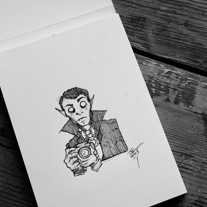 No serían buenos fotógrafos? Tiempo de práctica, no se reflejan en superficies, no proyectan sombras, capacidad de lidiar con niños y mascotas, y solo consumen… eso es otro tema #dracula #photographer #vampire #ink #illustration #cartoon #inktober #traditionalart #sketchbook