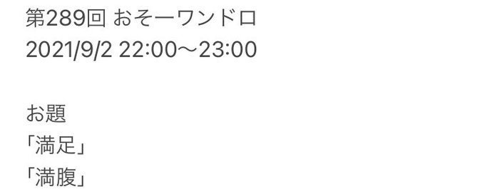 5 9 おはようございます。 本日22時より、第289回おそ一ワンドロを開催いたします。 お題 「満足」 「満腹」 お好きな方のお題を選択して創作してください。 たくさんのご参加お待ちしております! #おそ一ワンドロ 21/09/02 17:37