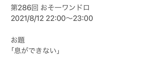 6 13 おはようございます。 本日22時より、第286回おそ一ワンドロを開催いたします。 お題 「息ができない」 たくさんのご参加お待ちしております! #おそ一ワンドロ 21/08/12 18:43