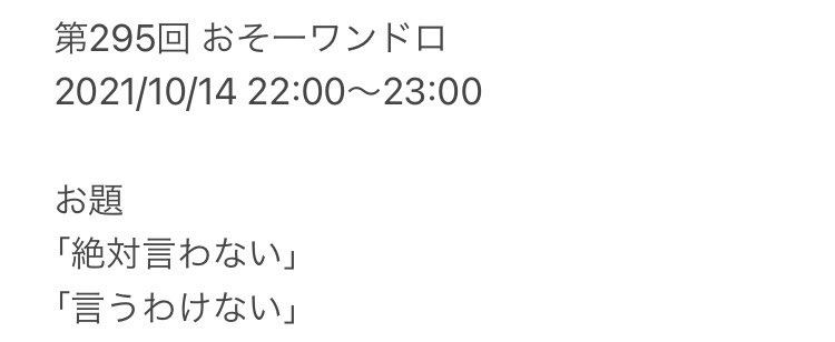 おはようございます。 本日22時より、第295回おそ一ワンドロを開催いたします。 お題 「絶対言わない」 「言うわけない」 お好きな方のお題を選択して創作してください。 たくさんのご参加お待ちしております! #おそ一ワンドロ