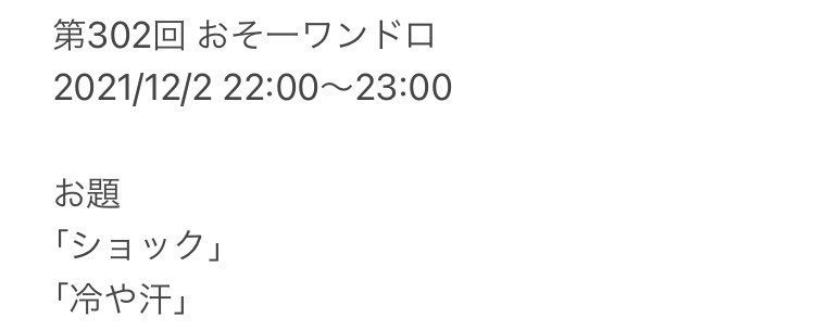 2 7 おはようございます。 本日22時より、第302回おそ一ワンドロを開催いたします。 お題 「ショック」 「冷や汗」 お好きな方のお題を選択して創作してください。 たくさんのご参加お待ちしております! #おそ一ワンドロ 21/12/02 18:56