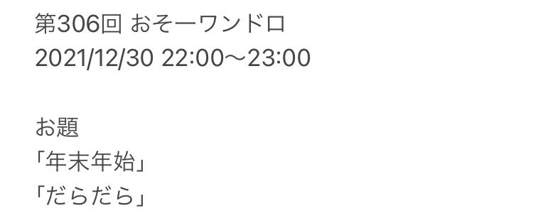 おはようございます。 本日22時より、第306回おそ一ワンドロを開催いたします。 お題 「年末年始」 「だらだら」 お好きな方のお題を選択して創作してください。 たくさんのご参加お待ちしております! #おそ一ワンドロ