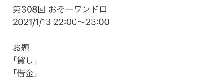 おはようございます。 本日22時より、第307回おそ一ワンドロを開催いたします。 お題 「貸し」 「借金」 お好きな方のお題を選択して創作してください。 たくさんのご参加お待ちしております! #おそ一ワンドロ