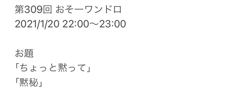 1 9 おはようございます。 本日22時より、第309回おそ一ワンドロを開催いたします。 お題 「ちょっと黙って」 「黙秘」 お好きな方のお題を選択して創作してください。 たくさんのご参加お待ちしております! #おそ一ワンドロ 22/01/20 16:18