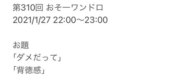 おはようございます。 本日22時より、第310回おそ一ワンドロを開催いたします。 お題 「ダメだって」 「背徳感」 お好きな方のお題を選択して創作してください。 たくさんのご参加お待ちしております! #おそ一ワンドロ