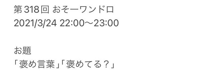 3 4 おはようございます。 本日22時より、第318回おそ一ワンドロを開催いたします。 お題 「褒め言葉」 「褒めてる?」 お好きな方のお題を選択して創作してください。 たくさんのご参加お待ちしております! #おそ一ワンドロ 22/03/24 19:24