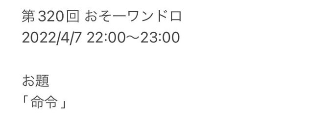 2 4 おはようございます。 22時より、第320回おそ一ワンドロを開催いたします。 お題 「命令」 たくさんのご参加お待ちしております! #おそ一ワンドロ 22/04/07 20:19