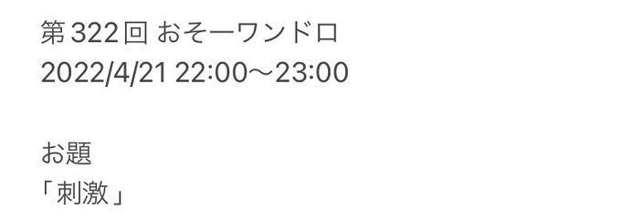 2 4 おはようございます。 22時より、第322回おそ一ワンドロを開催いたします。 お題 「刺激」 たくさんのご参加お待ちしております! #おそ一ワンドロ 22/04/21 19:54