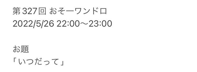 1 9 おはようございます。 本日22時より、第327回おそ一ワンドロを開催いたします。 お題 「いつだって」 たくさんのご参加お待ちしております! #おそ一ワンドロ 22/05/26 19:25