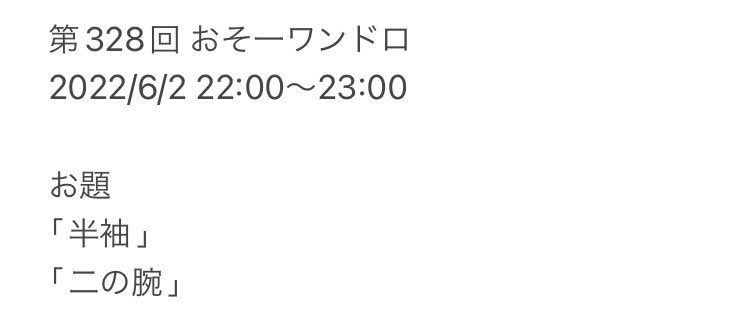 1 5 おはようございます。 本日22時より、第328回おそ一ワンドロを開催いたします。 お題 「半袖」 「二の腕」 お好きな方のお題を選択して創作してください。 たくさんのご参加お待ちしております! #おそ一ワンドロ 22/06/02 20:03