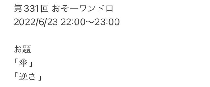 3 7 おはようございます。 本日22時より、第331回おそ一ワンドロを開催いたします。 お題 「傘」 「逆さ」 お好きな方のお題を選択して創作してください。 たくさんのご参加お待ちしております! #おそ一ワンドロ 22/06/23 18:38