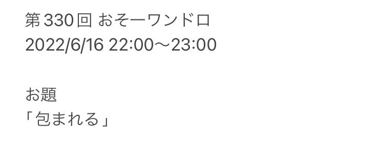 1 5 おはようございます。 本日22時より、第330回おそ一ワンドロを開催いたします。 お題 「包まれる」 たくさんのご参加お待ちしております! #おそ一ワンドロ 22/06/16 18:45
