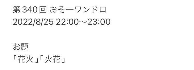 1 3 おはようございます。 本日22時より、第340回おそ一ワンドロを開催いたします。 お題 「花火」「火花」 お好きな方のお題を選択して創作してください。 たくさんのご参加お待ちしております! #おそ一ワンドロ 22/08/25 13:39