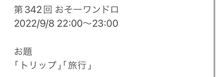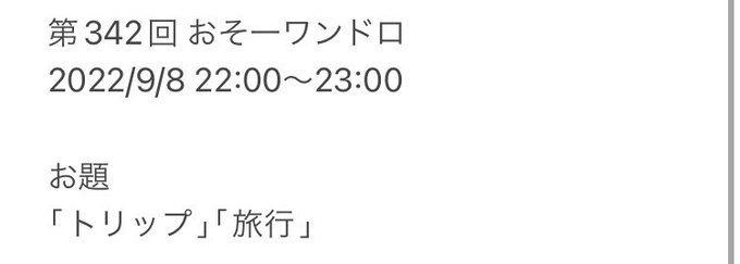1 5 おはようございます。 本日22時より、第342回おそ一ワンドロを開催いたします。 お題 「トリップ」「旅行」 お好きな方のお題を選択して創作してください。 たくさんのご参加お待ちしております! #おそ一ワンドロ 22/09/08 12:35