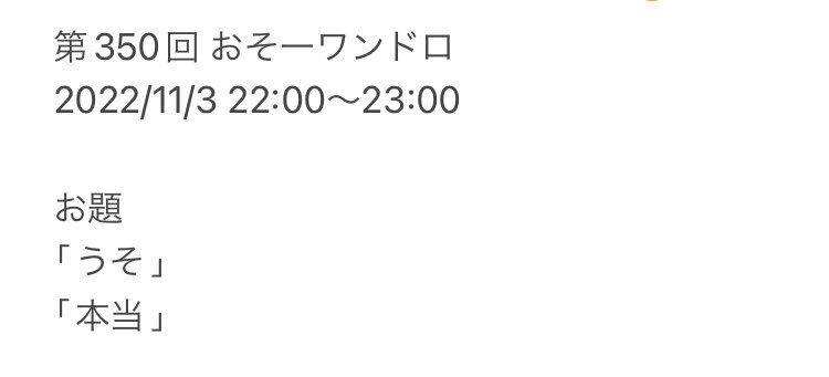 1 7 おはようございます。 本日22時より、第350回おそ一ワンドロを開催いたします。 お題 「うそ」 「本当」 お好きな方のお題を選択して創作してください。 たくさんのご参加お待ちしております! #おそ一ワンドロ 22/11/03 19:24