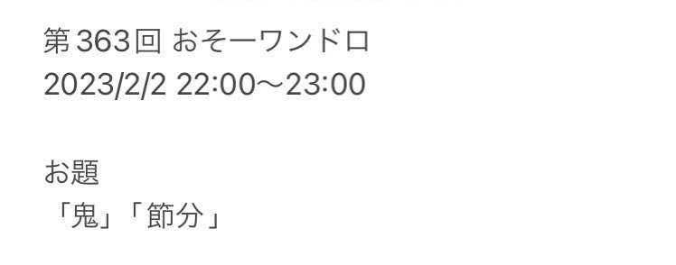 おはようございます。 本日22時より、第363回おそ一ワンドロを開催いたします。 お題 「鬼」「節分」 お好きな方のお題を選択して創作してください。 たくさんのご参加お待ちしております! #おそ一ワンドロ