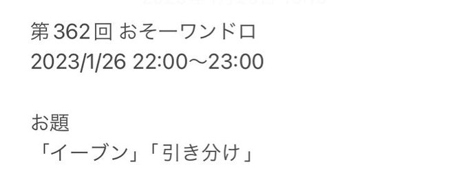 2 3 おはようございます。 本日22時より、第362回おそ一ワンドロを開催いたします。 お題 「イーブン」「引き分け」 たくさんのご参加お待ちしております! #おそ一ワンドロ 23/01/26 18:14