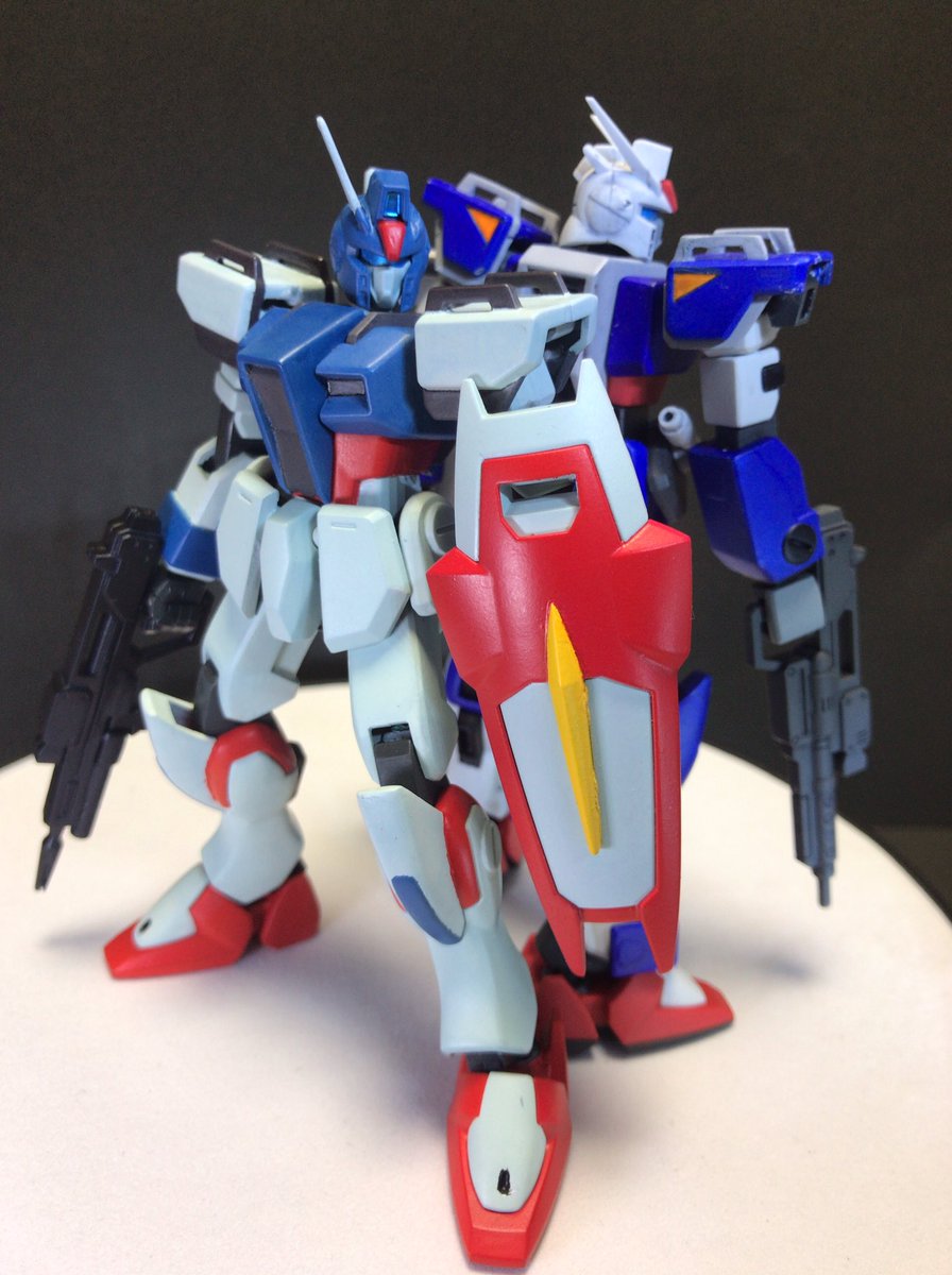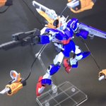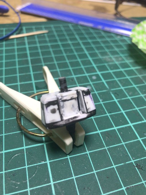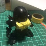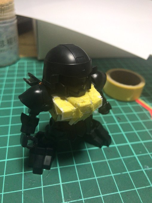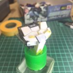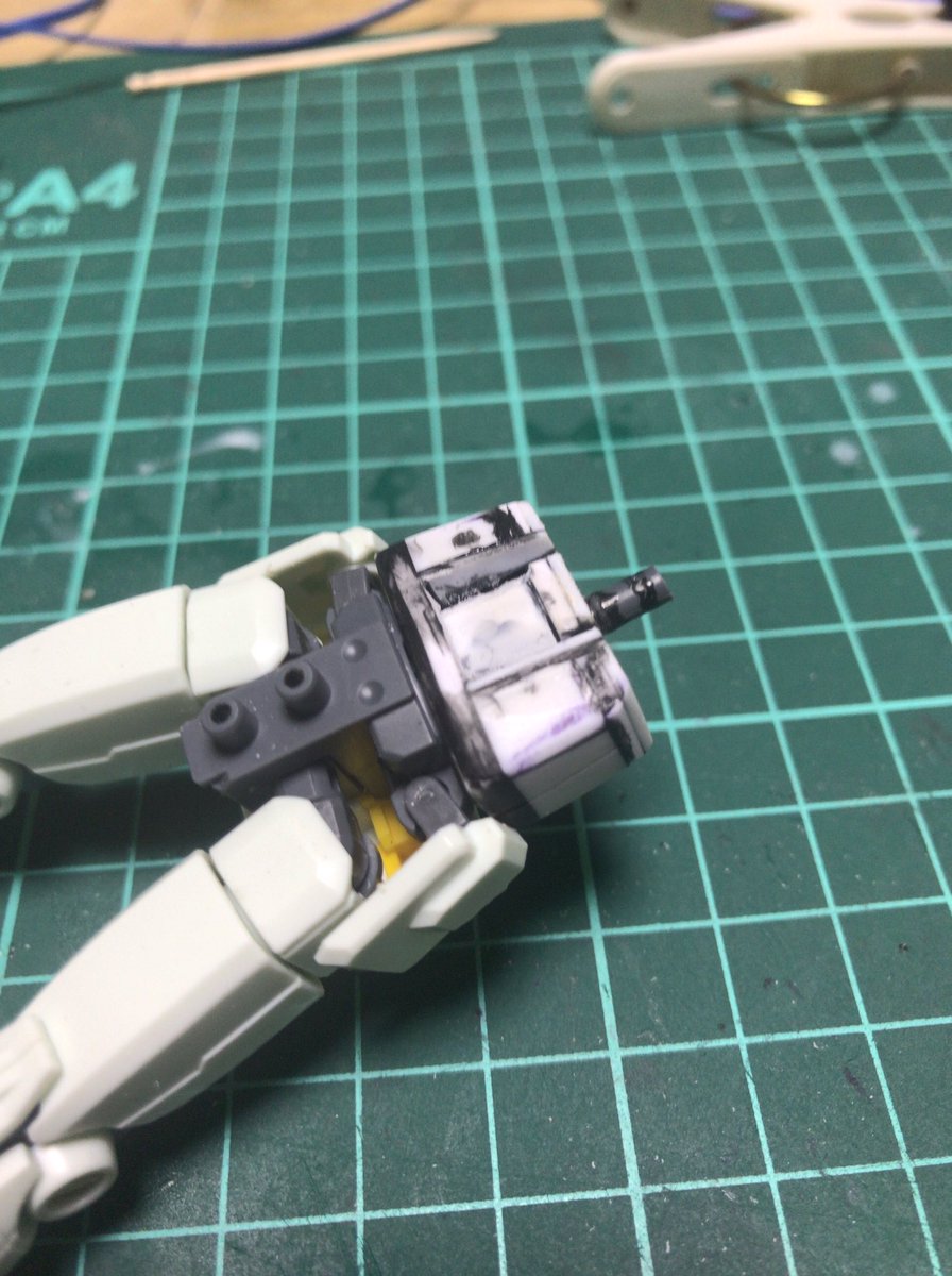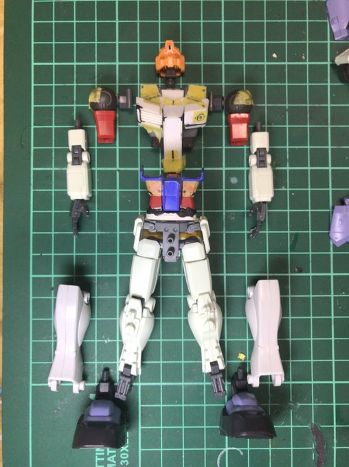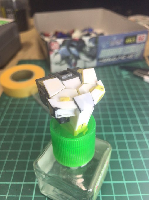 現在の進捗こんなです、を上げようと写真撮ってみたらなんかコアブロックシステム換装風景感出た気がした一枚🌝 腰、顔、前腕、肩外装、靴、全体バランス、etc…まだまだやることいっぱいです🤤 #ガンプラ #ゲム・カモフ作成課程