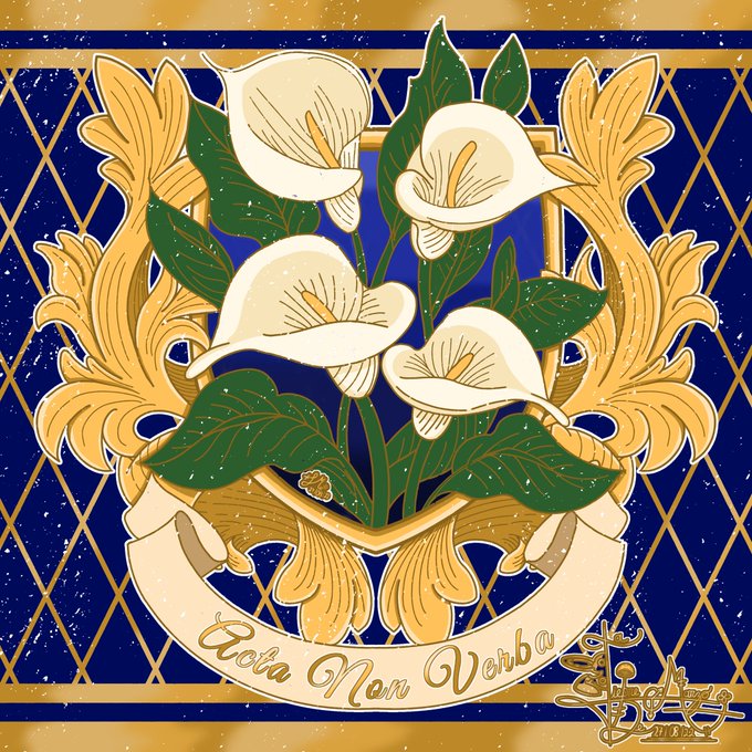 Este sería el emblema de mi familia. Tanto las alcatraces y el color azul es lo que nos distingue junto a la frase 'Acta Non Verva' (Acciones,no palabras) Define como somos 😏 #dibujodigital #dibujo #dijital #digitalar #art #drawing #myart #aestetic #aesteticarts #emblema #flores