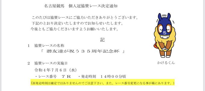 直前の告知ですがこの度、某作品が35周年を迎えるので何か形に残る方法でお祝いしたいと考えた結果、7/6に名古屋競馬場にてレースを開催していただくことになりました。 ド平日の14時開催となりますが、中継(YouTube)や競馬新聞などで楽しんでくだされば幸いです! 出馬表↓ nar.sp.netkeiba.com/special/?race_…