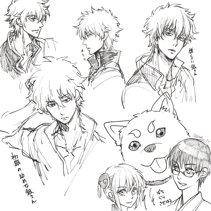 万事屋の練習らくがき(ほぼ銀さんだけど) 月詠ばっかり描いてるせいか他のキャラが全く安定しないので練習に。個人的に新八がめっちゃ難しい。
