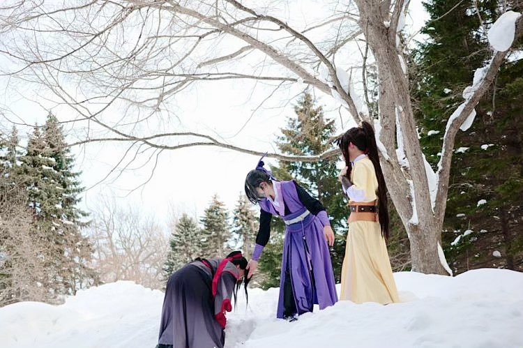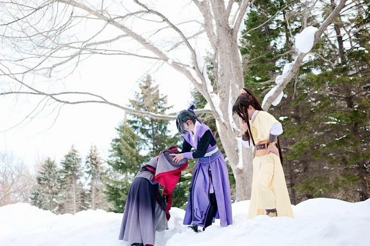 #レイヤーさんはコスプレの時のオフショットを晒して下さい 雪ロケで私だけ雪山登れなくて埋まって転んで…… 助けてくれる優しい江澄と笑う金凌…笑 そして天子笑…壊れた…😂 江澄:りんさん(@celeste1_2 ) 金凌:風さん(@DUSTHARD )