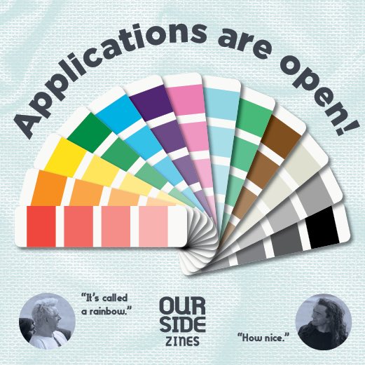 Only 1 week remains for this year's Our Side Zine artbook applications! A safe-for-work Pride-themed Good Omens trip through the rainbow with each artist assigned a specific color code. Apps close on February 19. docs.google.com/forms/d/e/1FAI… #GoodOmens #GoodOmensFanArt #pride2022