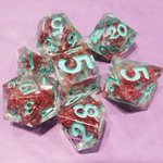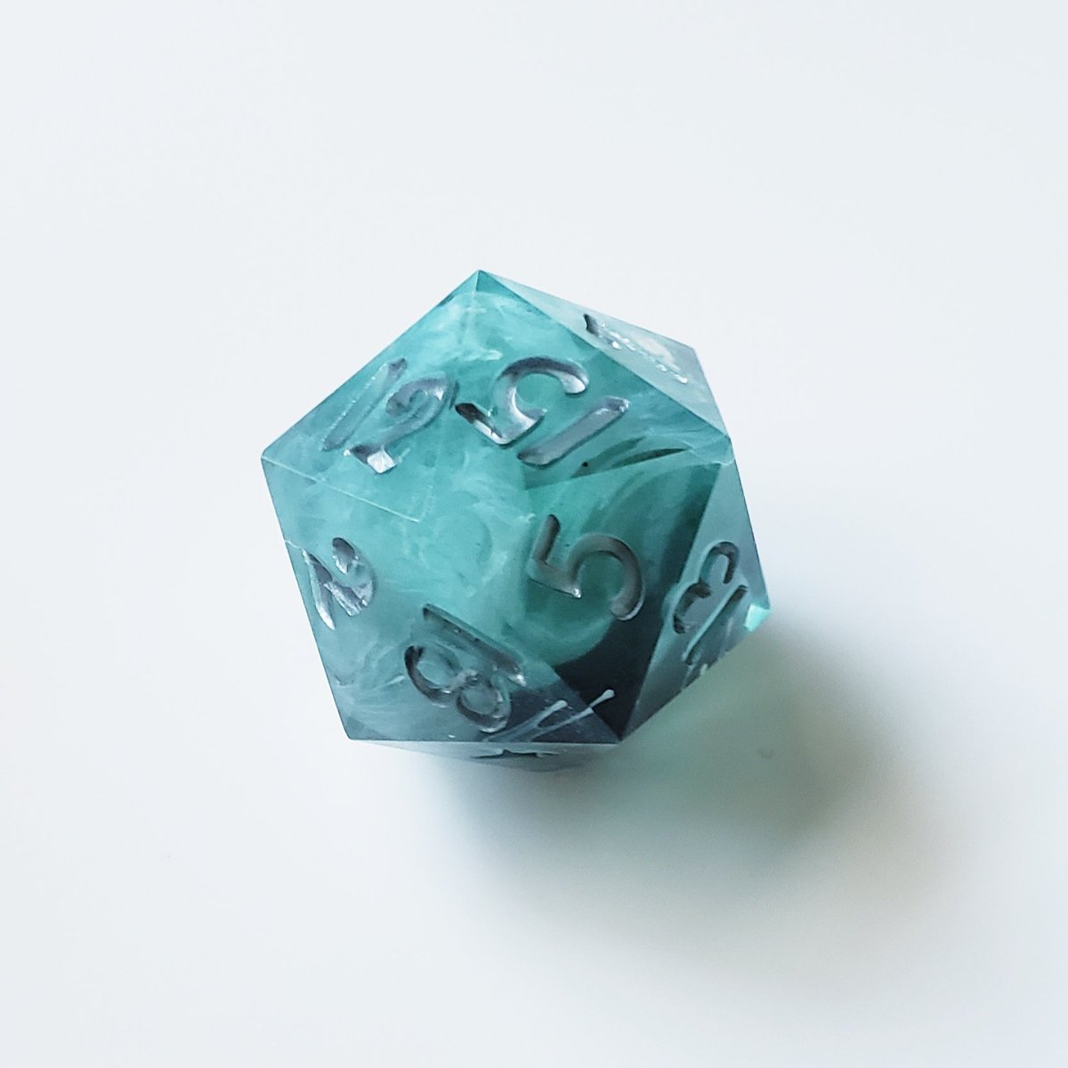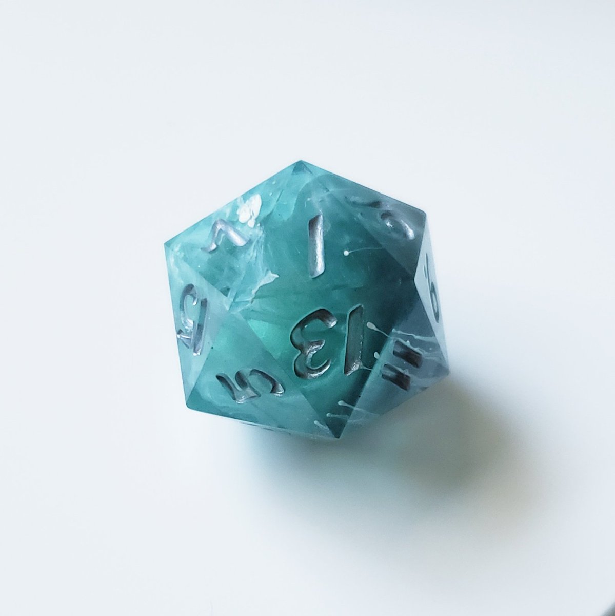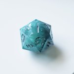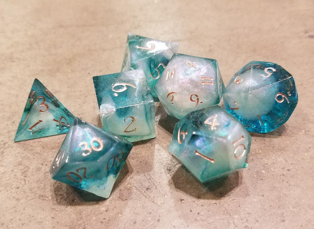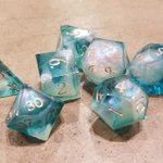 Here's the Fjord themed set I made for Travis. I can't emphasize how nice he is & even though he's not a big dice person he was still so appreciative 💙 I'd love to visit the turquoise waters and sparkling sands across the Menagerie Coast 🐠 #criticalrolefanart #handmadedice