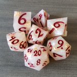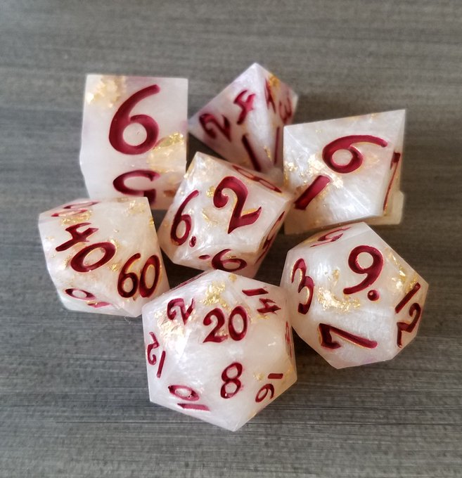 "The rule is that evil dies." Pearlescent white dice with gold flake for that Reani asethetic. Plus crimson numbers for blood of bad guys, obviously. Thank you @MicaBurton for such an adorable bamf!!! I hope these help you kick some butt! #criticalrolefanart #handmadedice
