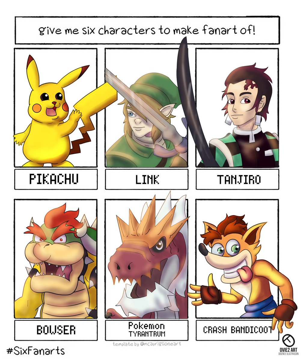 Hi everyone 👋😊 Finished the #SixFanartsChallenge with the characters they gave me #SixFanarts #sixfanart #SixFanartsChallenge #sixfanartchallenge #Nintendo #playstation #DemonSlayer #CrashBandicoot #illustration #digitalart #Pokemon #LegendofZelda #bowser