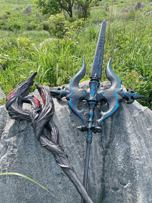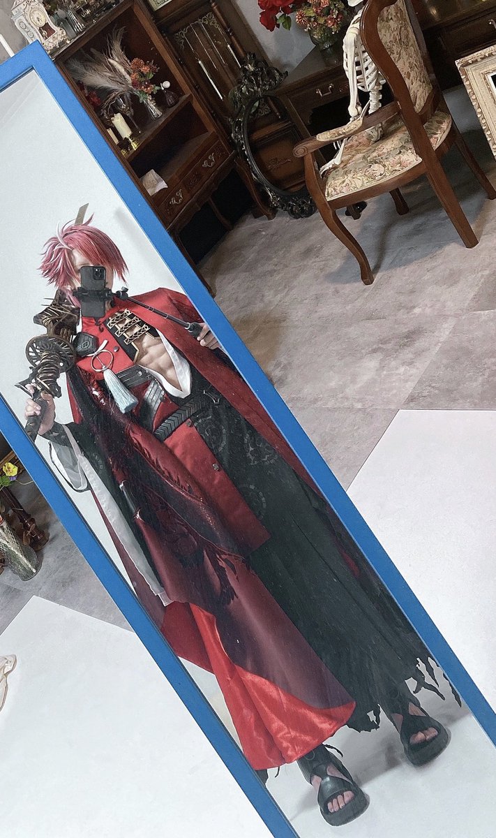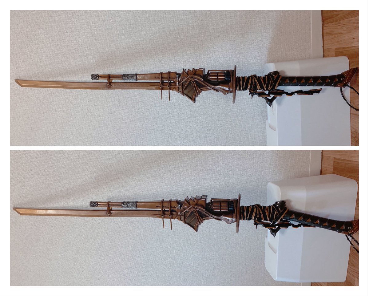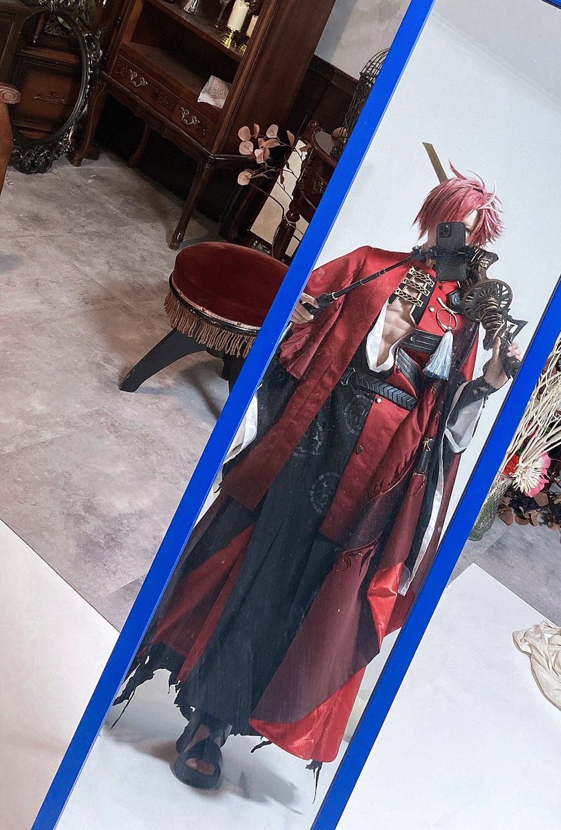 頑張った〜武器も布貼りの質感が好きなので布貼りです 袖の裏地が近しいやつ見つけれて気に入ってる、着た時のシルエット良くなるようにしました〜〜〜!