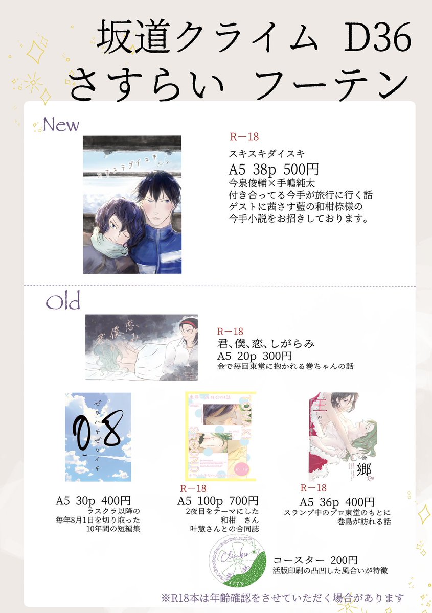 2023/2/26東京流通センター(TRC) 坂道クライム!13(坂クラ)のお品書きです! D36 さすらい 付き合ってる今手が旅行に行く話。ゲストに和柑㮈様(twitter.com/nagomikann7?s=…)の小説をお迎えしました! サンプル→ pixiv.net/artworks/10569… 今手新刊と東巻既刊があります よろしくお願いします!