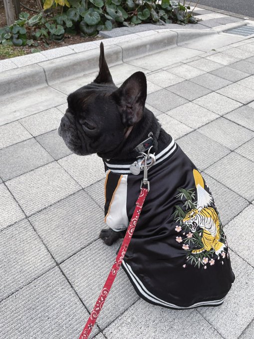 つとむさんいつもすっぽんぽんなのだけど、、 新しい土地でお散歩行ったら周りがお洋服着てるワンしかおらんので、ナメられないようにスカジャン着せた