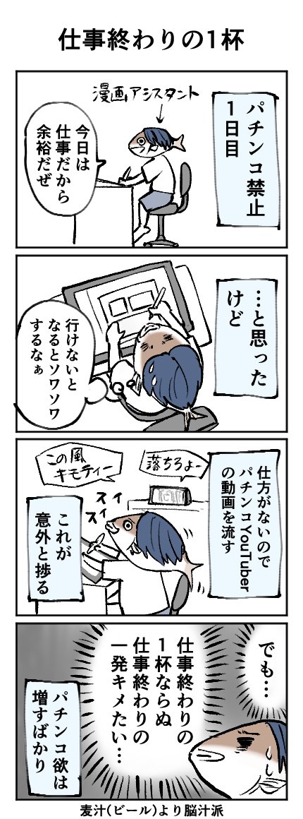 『打ちたきゃ歩け!パチン歩生活』 19日目🐟🐟 いや、まあ禁パチ中は仕事捗るからいいんですけどね(強がり&震え声) #実録漫画 #絵日記 #日常漫画 #4コマ漫画 #パチン歩生活編 #脱養分