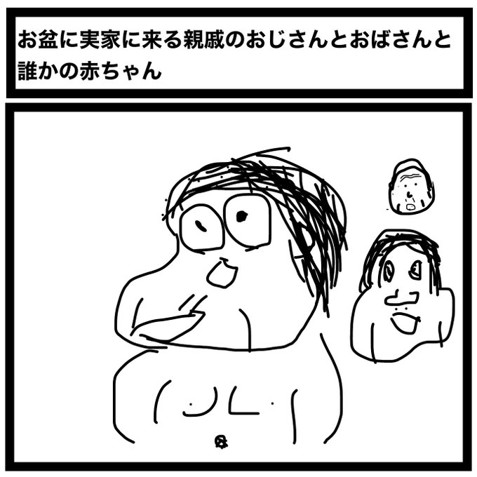 「お盆に実家に来る親戚のおじさんとおばさんと誰かの赤ちゃん」 おじさんは酔うとすぐに半裸になっておじいちゃんと演歌を歌い始める。 親戚らしき見知らぬ夫婦が玄関先まで連れてくる赤ちゃん。家に上がっていくほどの関係ではない。 #今日の落書き #絵描きさんと繋がりたい #絵