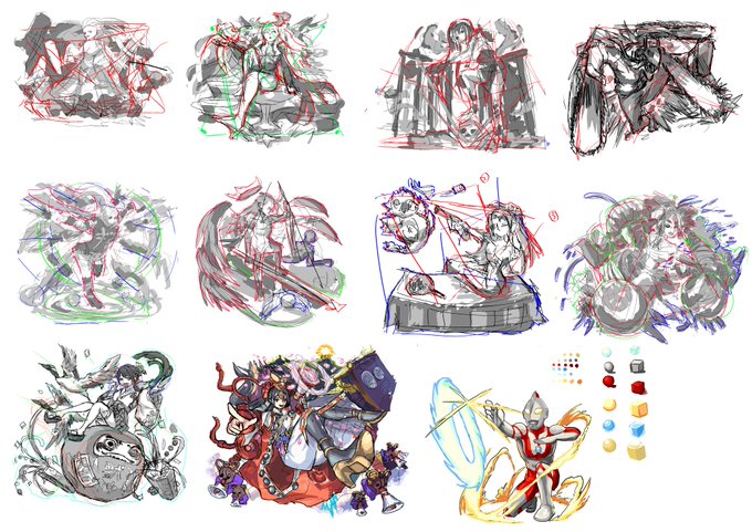 0 3 三ヶ月上達法練習記録 構図と明暗のバランスのお勉強。そしてラスト二枚は色使いの研究 使用した色を単純な図形に表してみたらただ模写するより理解度が高くなった。 エフェクトの配置とかかなり考えられてて、それに気付けて感動した #モンスト #イラスト 23/03/05 16:18