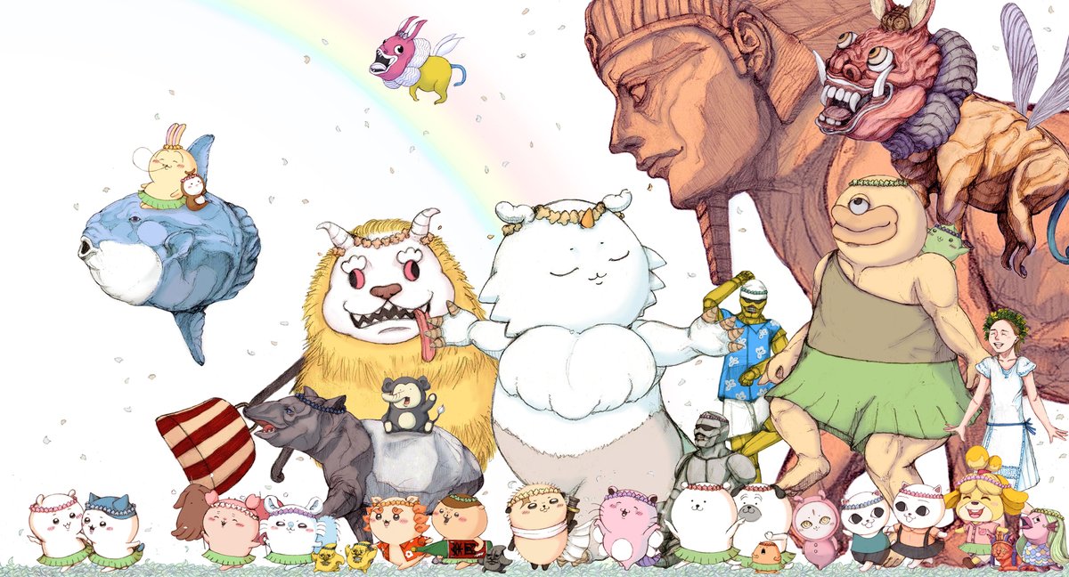 ちいかわのイラスト 『喜びの島』 ( cast ) ちいかわ ハチワレ うさぎ カニちゃん モモンガ シーサー くりまんじゅう ラッコ 鎧さん あのこ でかつよ and mysterious characters & beautiful strangers #ちいかわファンアート