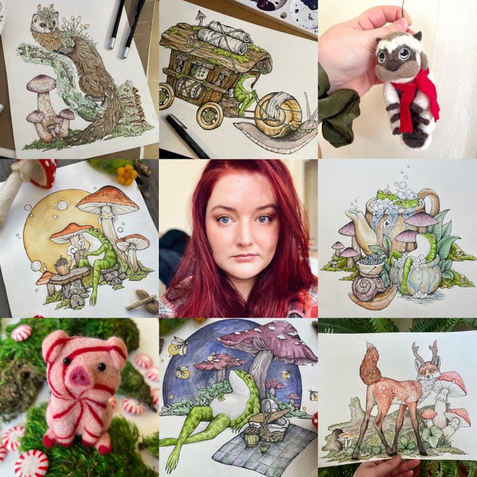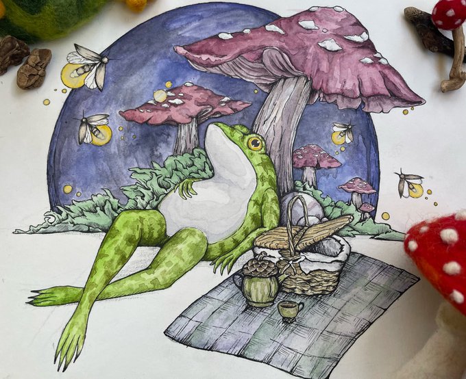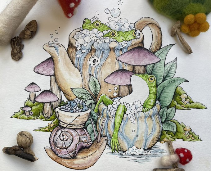 Spa day with the frogs! with just a little existential dread.😬#frogs #AnimalArtistsUnite #mushrooms #watercolorpainting #animalart