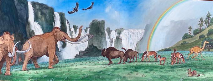 My painting of San Francisco Bay 20,000 yrs ago for my children’s book (out of print). Giant waterfall like Niagara at golden gate from Sac-SanJoaquin river pouring over cliff before Bay existed. Columbian Mammoth, bison, horse, camel. #pleistocene #paleoart