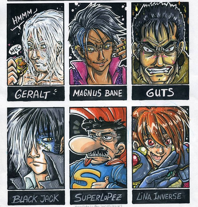 Tercera tanda del reto de #sixfanartschallenge. Guts se me ha atragantado un poco, por eso se parece como un huevo a una castaña, pero ha sido divertido. #SixFanarts #slayers #thewitcher #superlopez #Berserk #shadowhunters #blackjack Aún me quedan más y más por hacer =)
