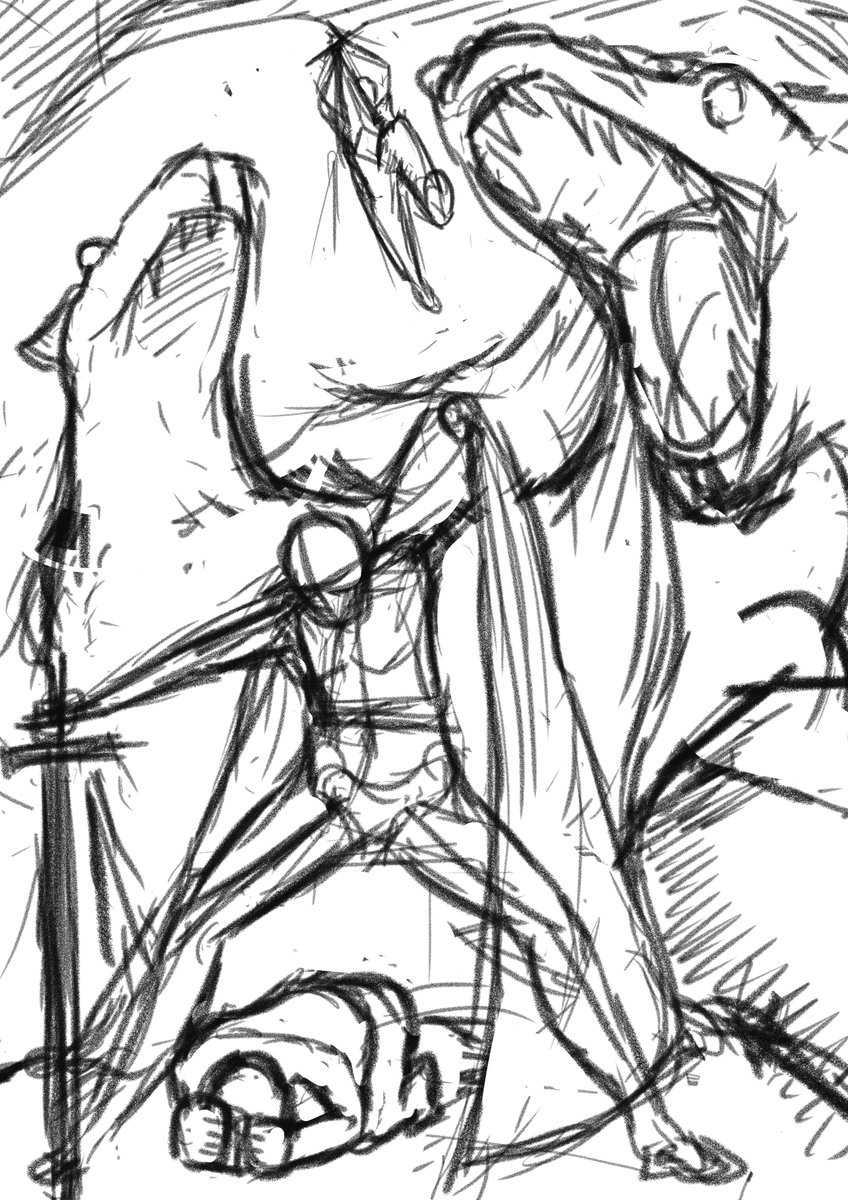 ラフ中・・・ オルトロス戦で窮地に陥っている状況をイメージしてお絵描き中・・・ #イラスト #イラスト好きな人と繋がりたい #モンスター