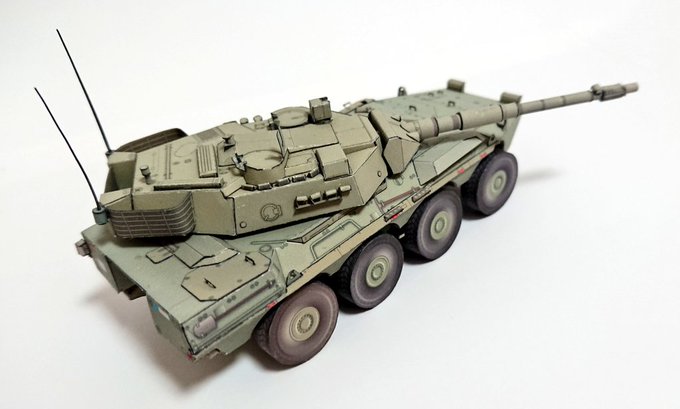 イタリア陸軍 チェンタウロ戦闘偵察車 (1/72) 全て紙でできています 前に一度完成させましたが、アンテナを追加したので再掲しました 展開図は箱乃工房さんのHP (boxstudio.main.jp/2019/09/28/b1-…)で無料公開されているので、是非チャレンジしてみてください! #ペーパークラフト