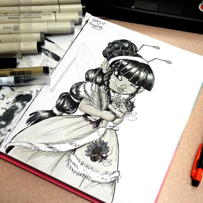 Day 4: Royalty I drew my Characters Reina and Fuega. I have been wanting to draw mama and daughter for a while so I took advantage of the prompt. Baby Fuega is so cute :3 Queen and princess of the bees. #inktober2019 #ink #inktober #inktoberday4 #myoc #twitterartist