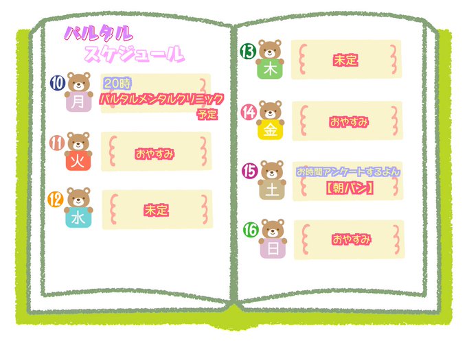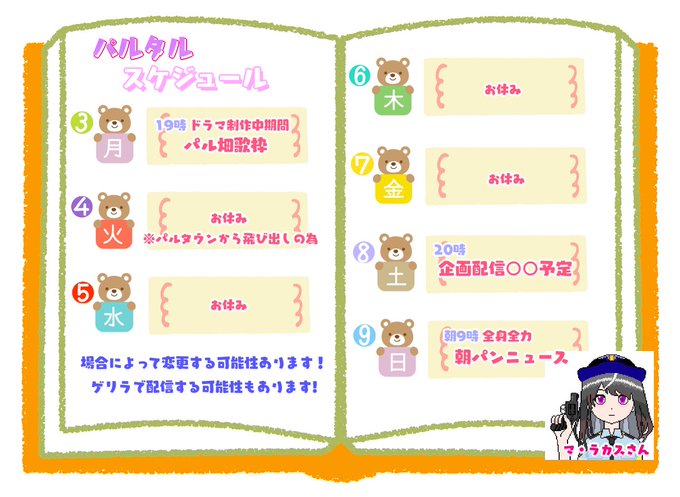 🗓今週のスケジュール🗓️ 🤖#パルタル 🧑#チームパンツ 🎨#パルタルイラスト 🖼使用しても良いイラスト #パルタルイラスト可 YouTube bit.ly/3roZZGo ショップpartal.booth.pm マシュマロbit.ly/3zlhLA3