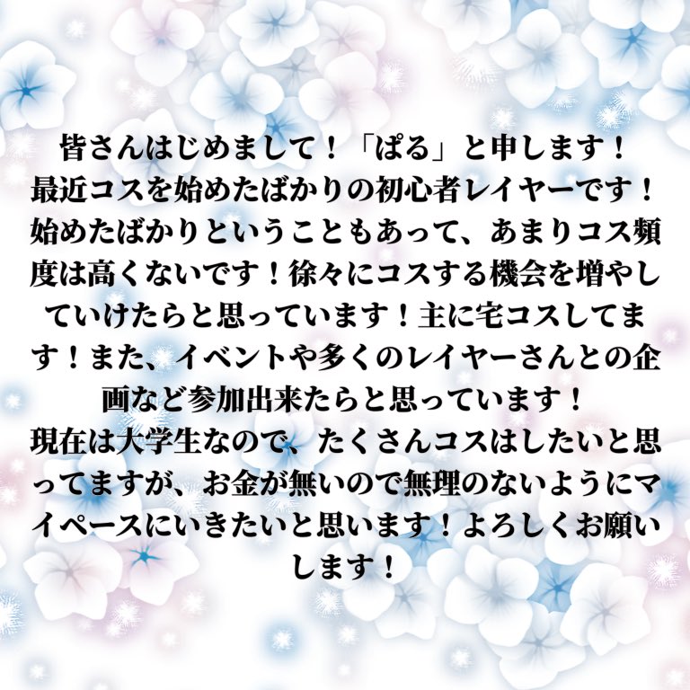 #コスプレイヤーさんと繋りたい #初心者レイヤーさんと繋がりたい #コスプレ はじめまして🤩 宅コス中心の初心者レイヤー「ぱる」です!初タグ投下失礼します!!! ❤♻️をしてくださった方中心にお迎えしたいと思います!出来れば💬もいただければ嬉しいです🥰