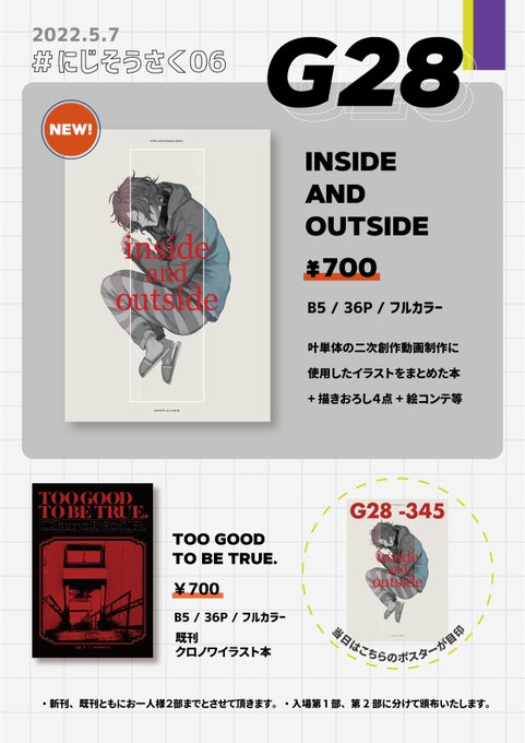 275 1495 #にじそうさく07 【お-48】サークル:-345でのお品書きとなります。記載の通り私の頒布物は全てお一人様1つまでとなります。セットでないもとセットのものがありますので間違いのないようご注意ください。 23/04/29 19:57